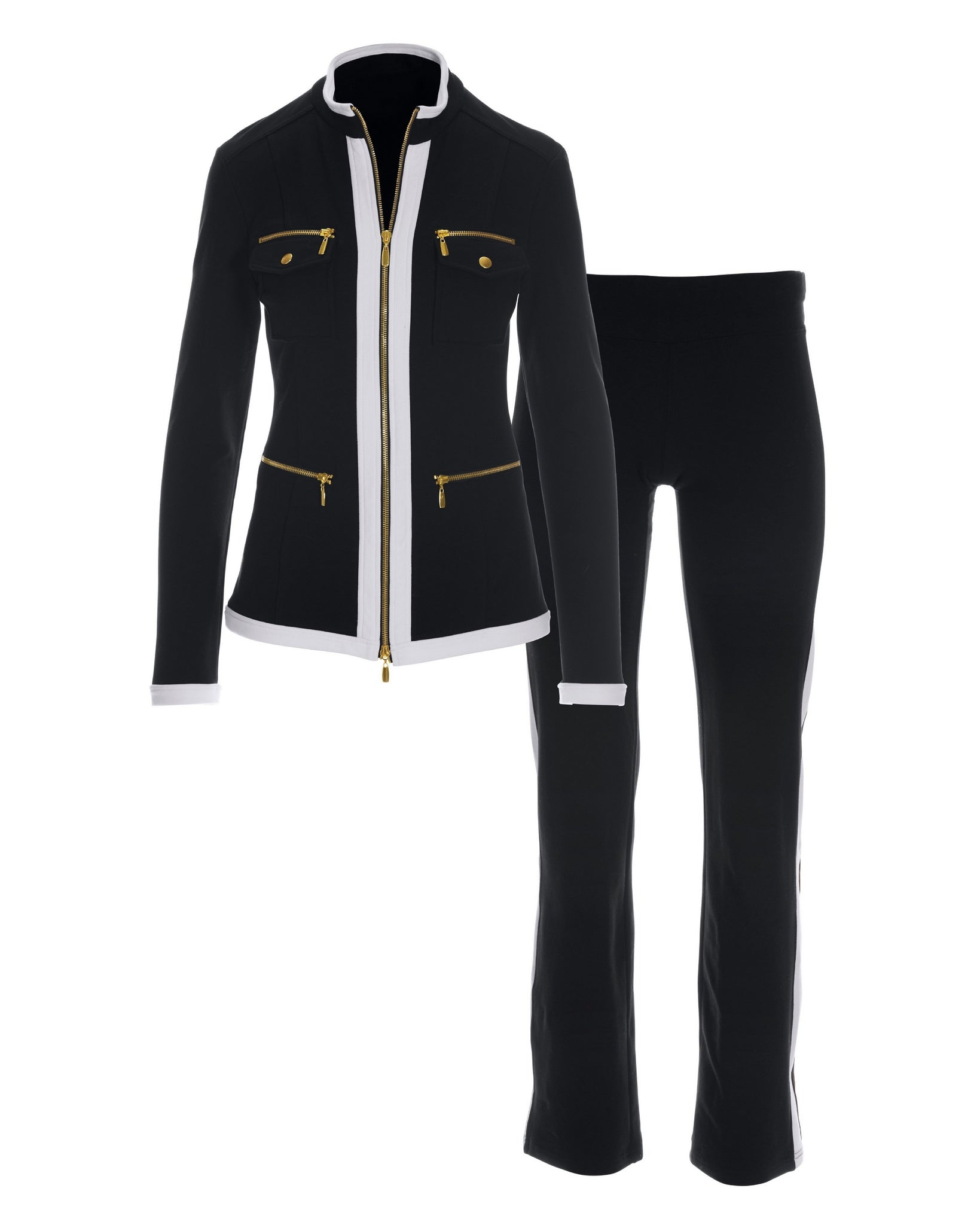 Sophisticated and chic, this sporty warm-up checks all the boxes for effortless style. The plush French terry set includes a comfortable two-way gold-tone zip jacket with zip pockets and an easy pull-on elastic-waist pant for on-the-go and off-duty days.