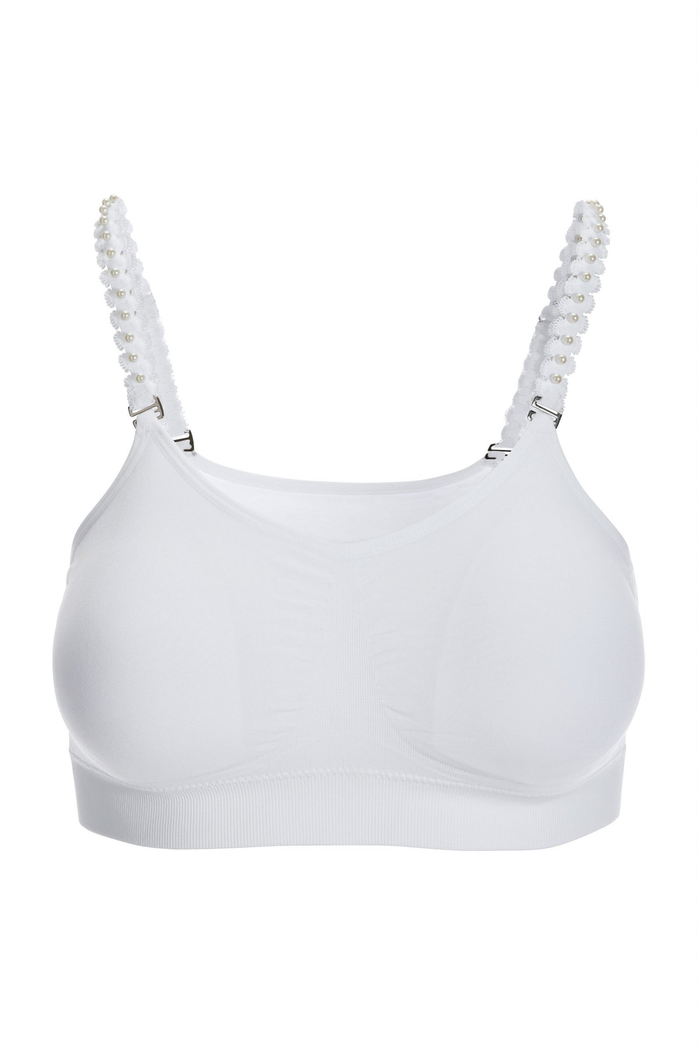 With iridescent faux-pearl beaded feminine straps meant to show, this fashion bralette is especially stylish with off-the-shoulder tops or button-up blouses. Its seamless construction offers a smooth look and supportive stretch fabric gives you all-day comfort.