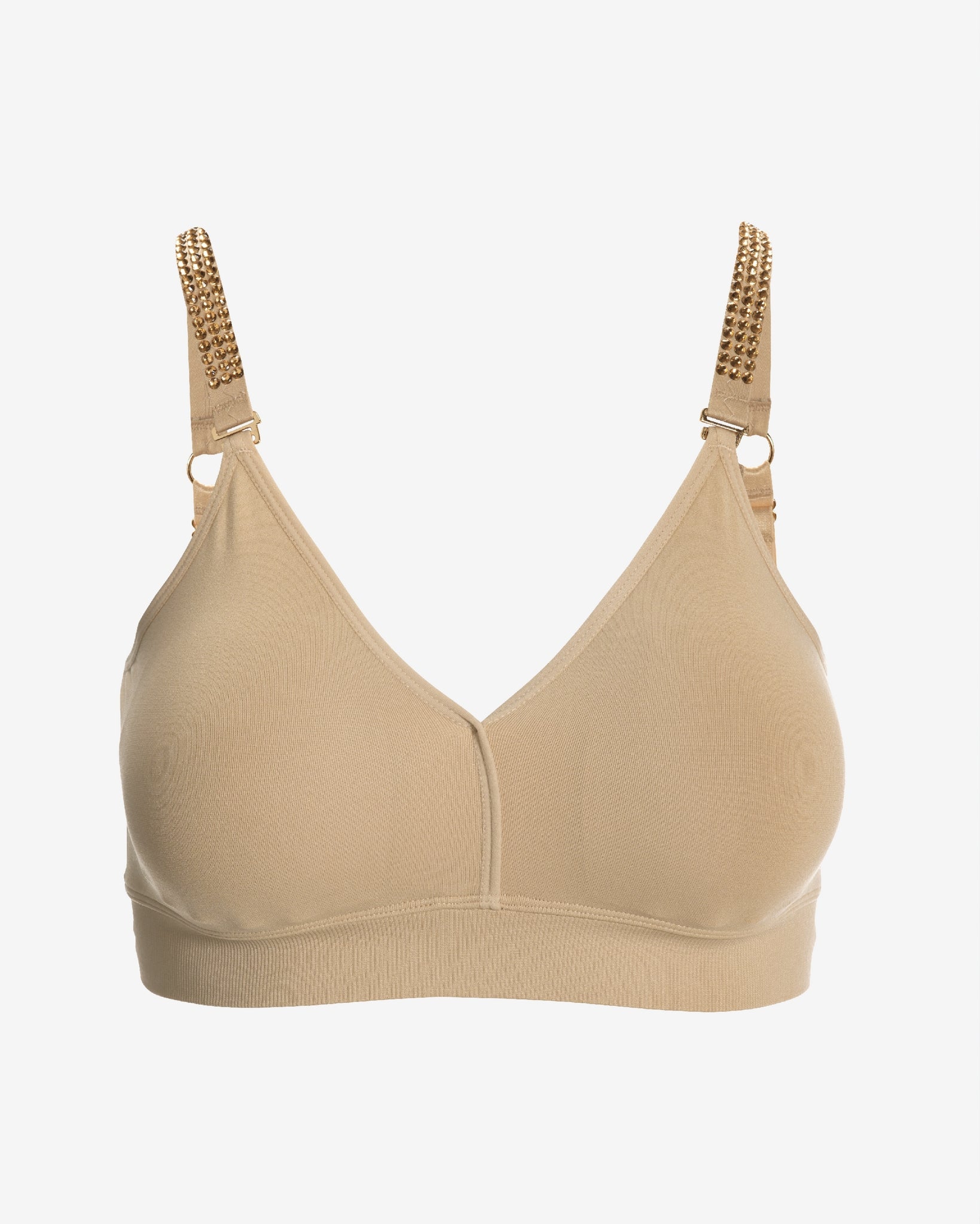Featuring sparkling crystal straps meant to be seen, this fashion bralette is ideal for pairing with off-the-shoulder tops or button-up blouses. The seamless design gives a sleek look, while the stretch fabric provides support and comfort all day long.