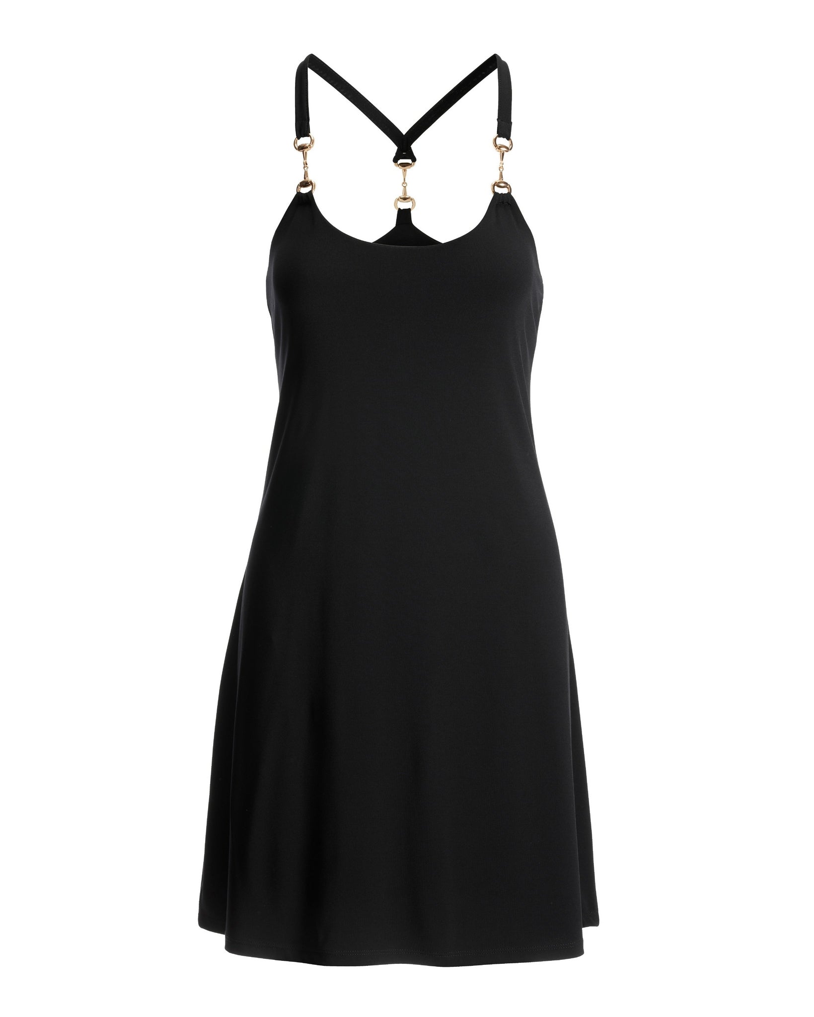 Simplicity never looked so good. Distinctive hardware details highlighting the shoulders and back is all this dress needs as it effortlessly drapes for a comfortable, flowy look and feel.