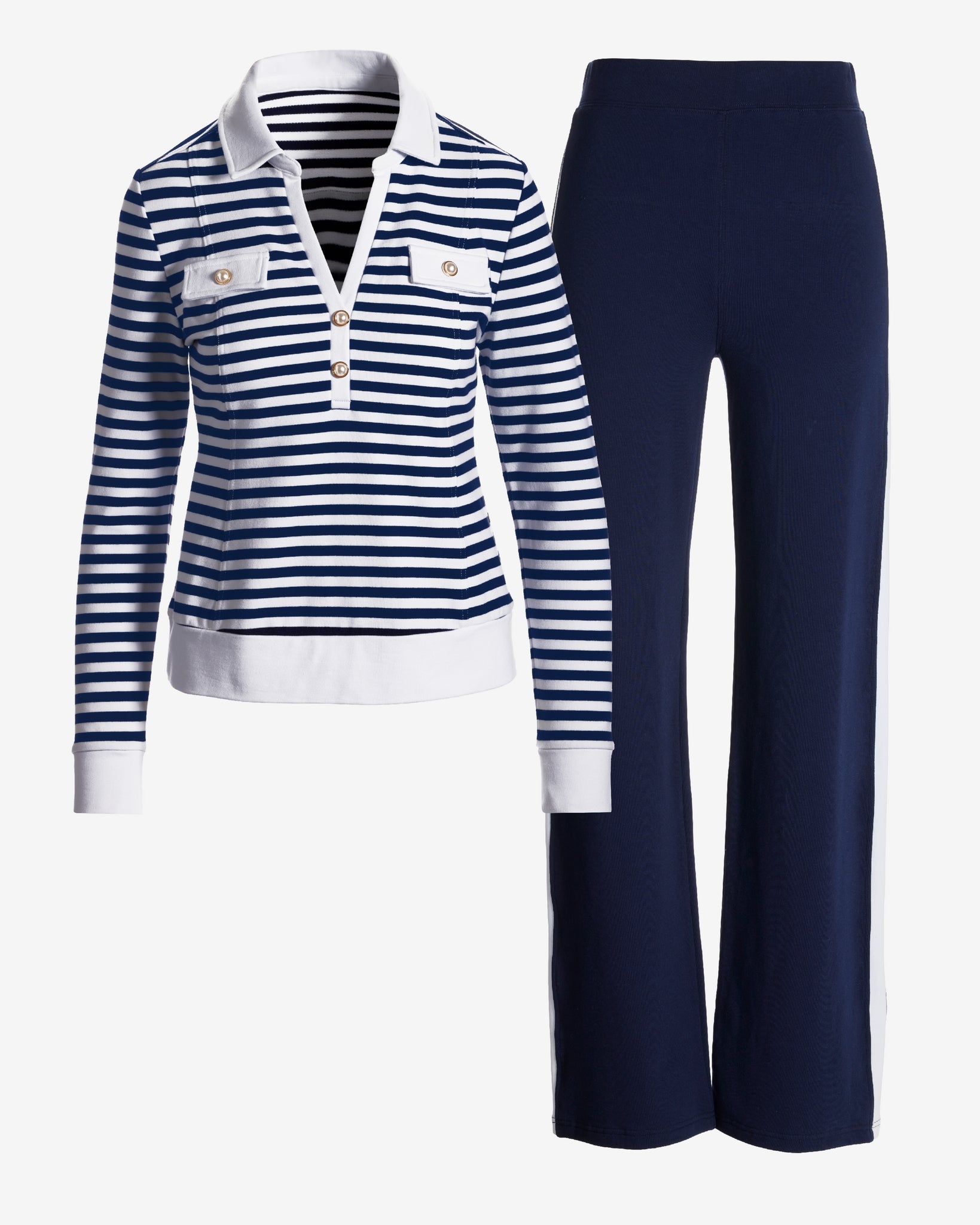 Our Pearl Stripe French Terry Top and Pant Set offers a polished take on nautical style. The striped, polo-style top features pearl accents along the front, while the wide-leg pants complement seamlessly. Pair with espadrilles or flats for boat rides, beach drives, or a casual weekend getaway.