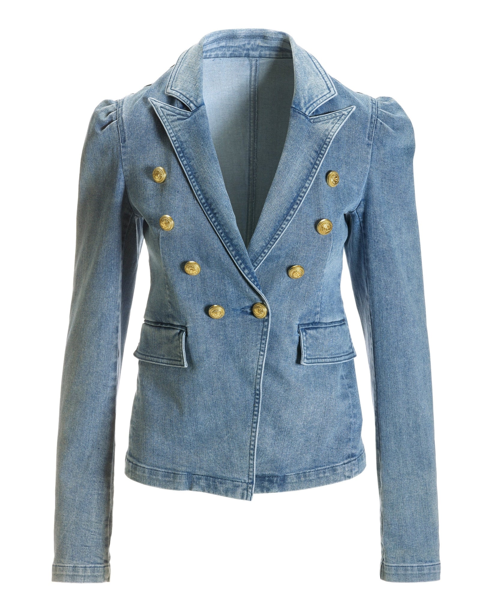 Designed to create head-to-toe statement looks, this tailored double-breasted denim jacket features feminine puff sleeves, crested button details and a hint of comfortable stretch.