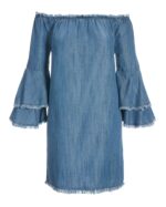A flirty look with bohemian style. This off-the-shoulder chambray dress has a super-soft feel, tiered bell sleeves and a mini length. Detailed with frayed edges for an edgy accent, we love this effortless piece with ankle boots, embellished sandals or cork wedges.